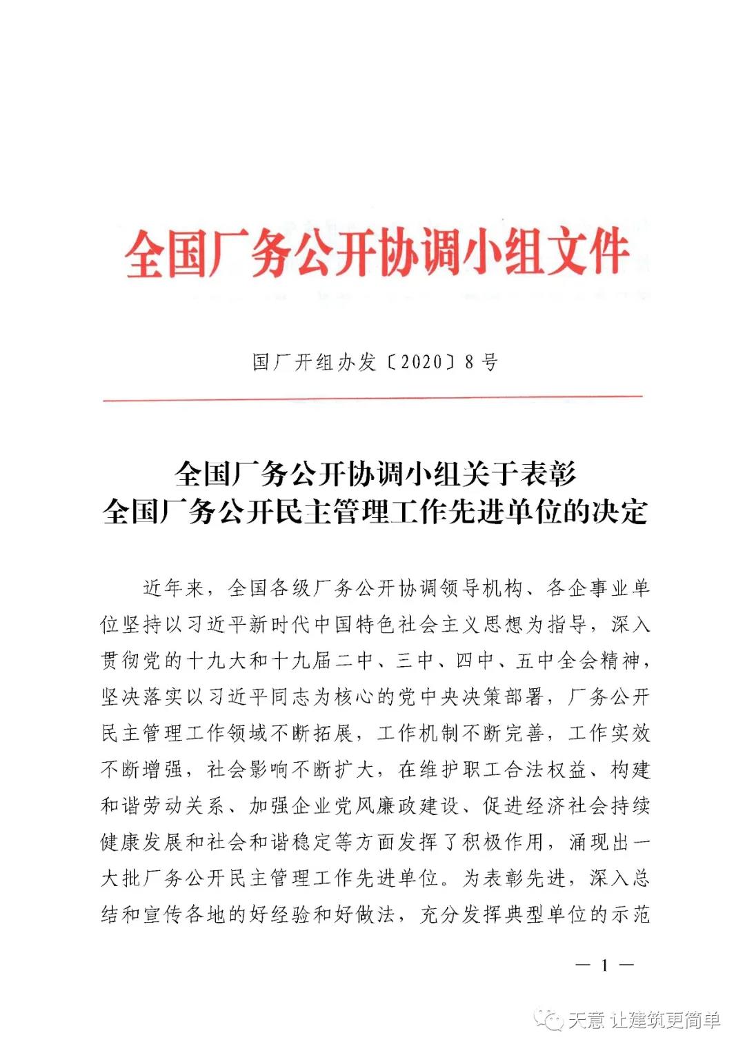 12月11日,從全國總工會傳來喜訊,山東天意機械股份有限公司被授予“全國廠務(wù)公開民主管理先進單位”稱號。